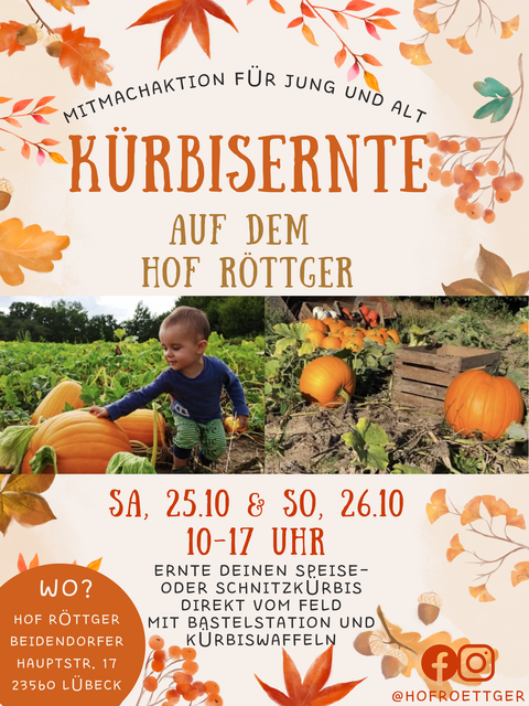 Auch dieses Jahr findet wieder Ende Oktober (25.-26.10.2025) unser Kürbisfest auf dem Hof statt, kommt gerne vorbei!